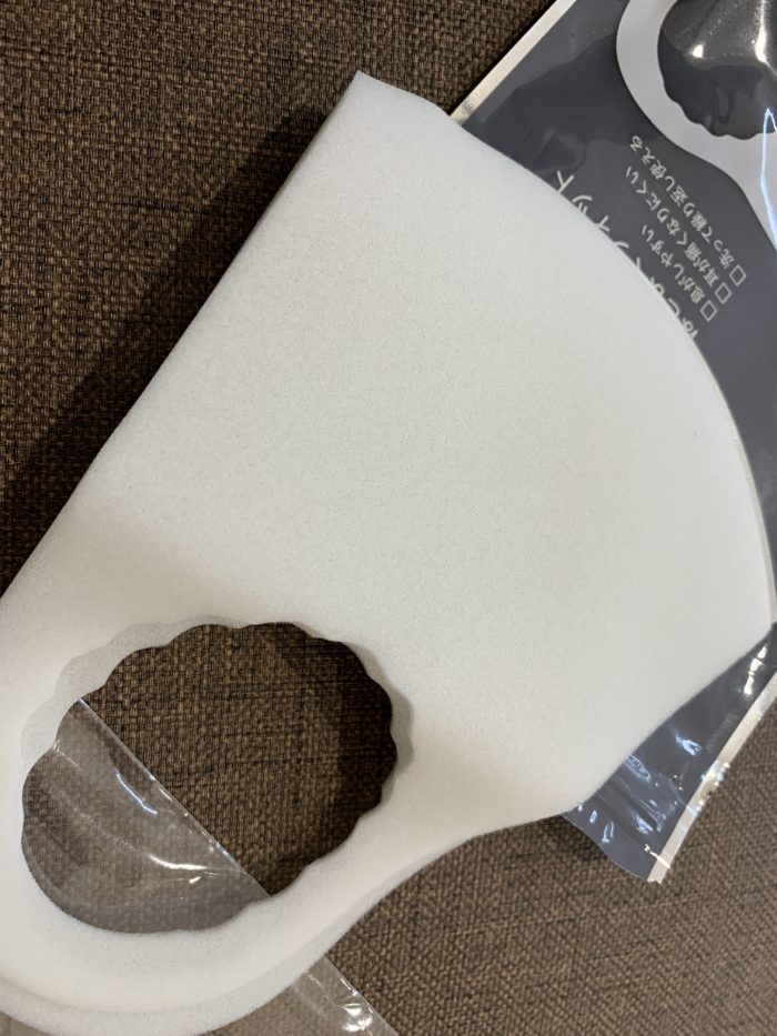 マスク本体を触ってみた感触としては、桃などの柔らかいフルーツを保護するためのウレタンとビニールの中間のようなネットがあると思うのですが、あれに似たような感じのスポンジ素材です。